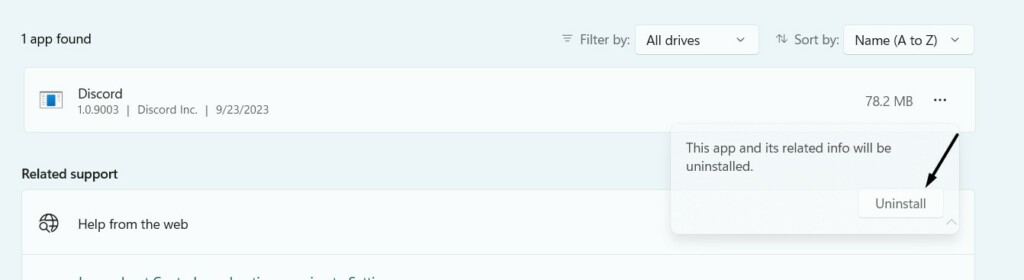 2.ImInstallierte AppsAbschnitt, suchen Sie nachZwietracht, klicken Sie aufdrei Punkte (…)daneben und wählen SieDeinstallierendavon.