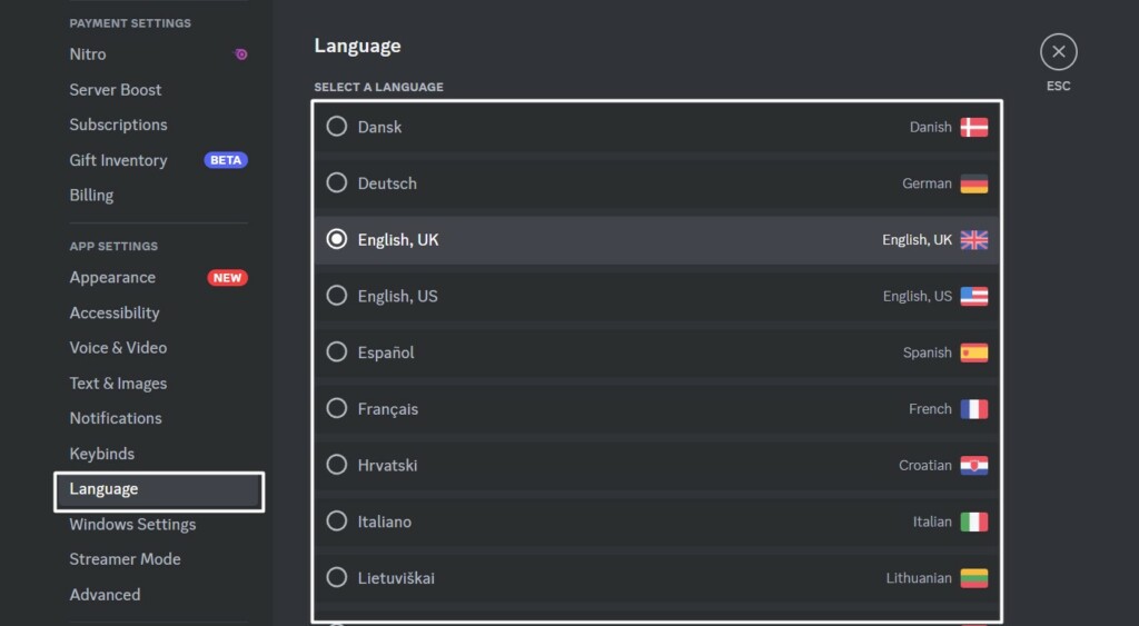Für einige BenutzerÄndern der Standardsprache von DiscordDas Problem, dass BetterDiscord nicht funktioniert, wurde behoben. Daher empfehlen wir Ihnen, dasselbe zu tun, da dadurch die Designeinstellungen des Clients zurückgesetzt werden. Sie können die unten aufgeführten Eingabeaufforderungen überprüfen, um zu erfahren, wie Sie dies ganz einfach tun können: