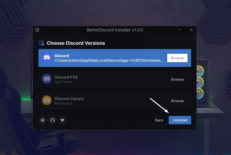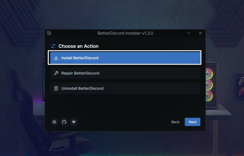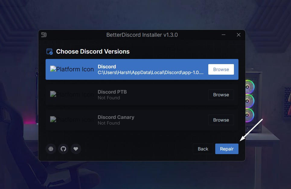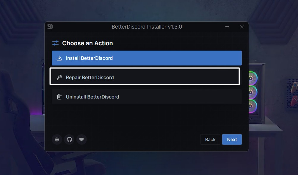 Sie erhalten die Möglichkeit zur ReparaturBetterDiscordnur im Installationsprogramm. Befolgen Sie die folgenden Schritte, um BetterDiscord zu reparieren: