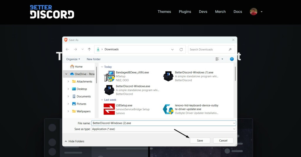 2.Klicken Sie aufSpeichernSchaltfläche in derSpeichern unterSie werden aufgefordert, die BetterDiscord-Datei auf Ihren PC herunterzuladen.