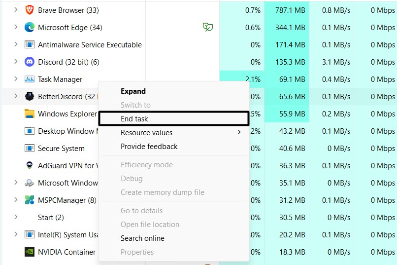 2.Sobald es geöffnet ist, suchen Sie nachBetterDiscordimProzesseAbschnitt und klicken Sie mit der rechten Maustaste darauf.