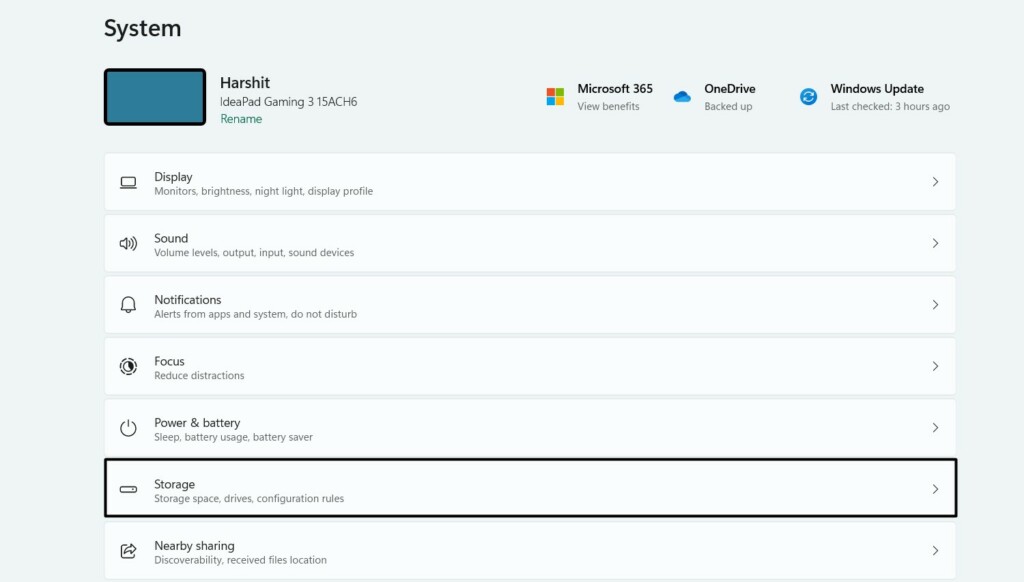 1.Öffnen Sie dieEinstellungen-Appauf Ihrem Windows 11-PC und klicken Sie aufLagerungOption untenSystem.