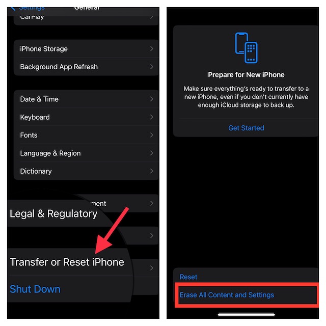 - Navigieren Sie anschließend zuEinstellungen-App > Allgemein > iPhone/iPad übertragen oder zurücksetzen > Alle Inhalte und Einstellungen löschen.