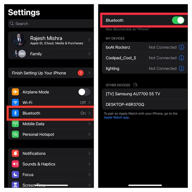 - Starten Sie jetzt Ihr iPhone neu. Gehen Sie nach dem Neustart Ihres iPhones zurück zu den Bluetooth-Einstellungen und schalten Sie es ein.