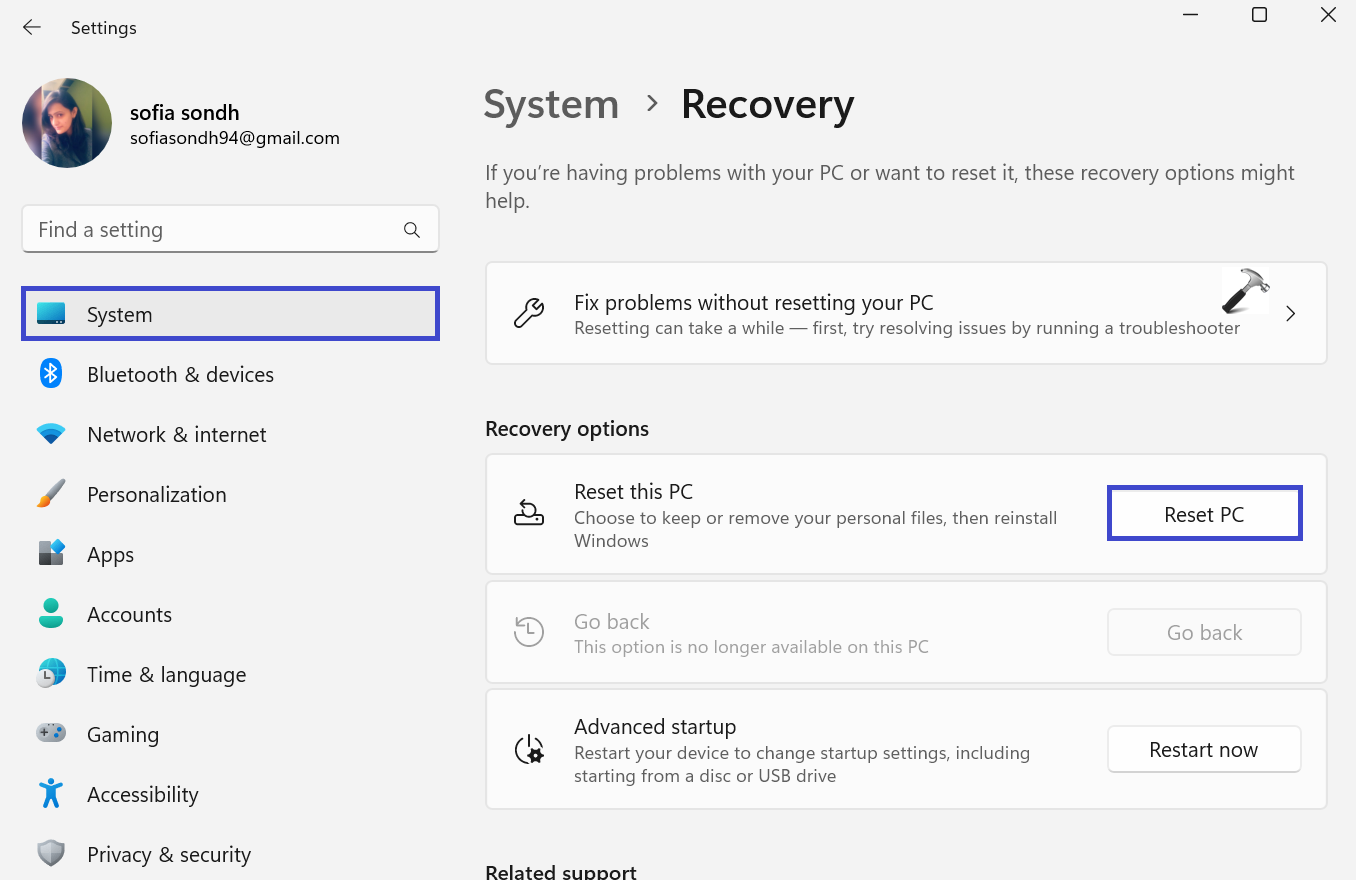 2. Unter dem „WiederherstellungsoptionenKlicken Sie im Abschnitt auf die Schaltfläche „PC zurücksetzen”-Option.