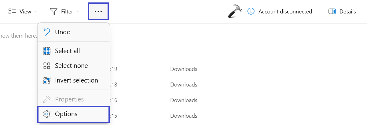 1. Öffnen Sie den Datei-Explorer. Klicken Sie auf die drei horizontalen Punkte (…) und wählen Sie „Optionen” aus dem Menü.