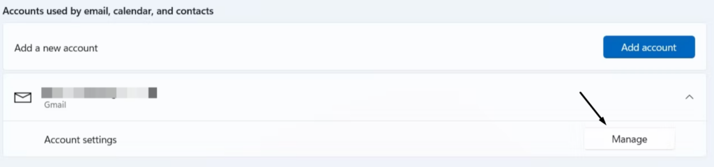4.Klicken Sie aufVerwaltenSchaltfläche nebenKontoeinstellungen, und wählen Sie dannÄndern Sie die Synchronisierungseinstellungen für Postfächer.