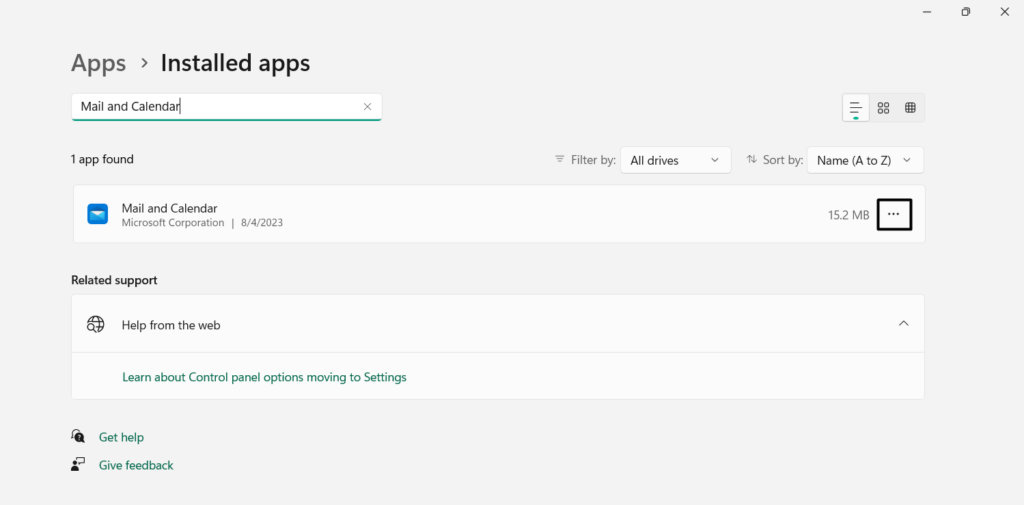 2.Suchen Sie nach demMail- und Kalender-Appauf dem nächsten Bildschirm und klicken Sie aufdrei Punkte (…)daneben.