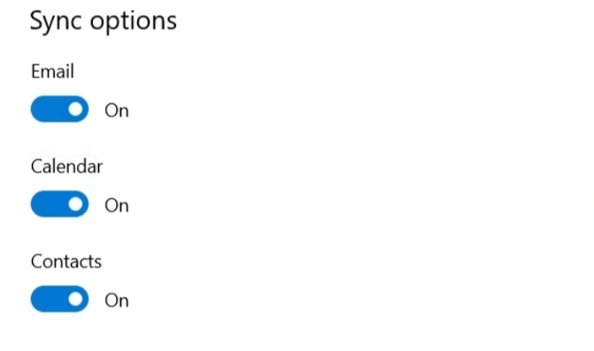 6.Aktivieren Sie abschließend dieE-Mail,Kalender, UndKontakteschaltet um und klicktErledigtum die Einstellungen zu speichern.