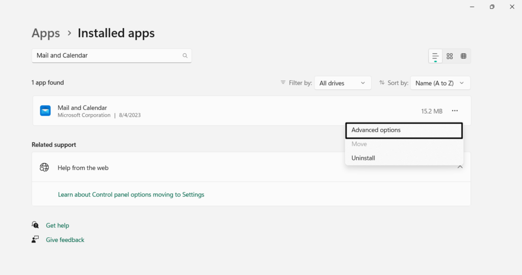 Einstellungen > Apps > Installierte Apps > Nach der Mail- und Kalender-App suchen > Drei-Punkte-Menü (…) > Erweiterte Optionen > Klicken Sie auf die Schaltfläche „Zurücksetzen“.