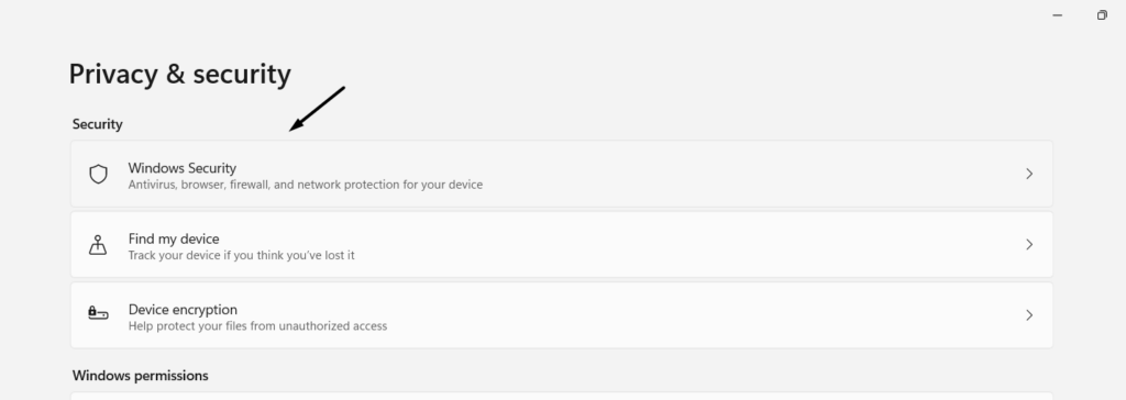2.ImSicherheitAbschnitt, wählen Sie dieWindows-SicherheitOption zum Zugriff auf alle Datenschutzeinstellungen.