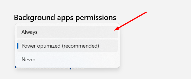 4.Schließlich, Wählen Sie die ausStetsOption aus demBerechtigungen für Hintergrund-AppsDropdown-Menü.