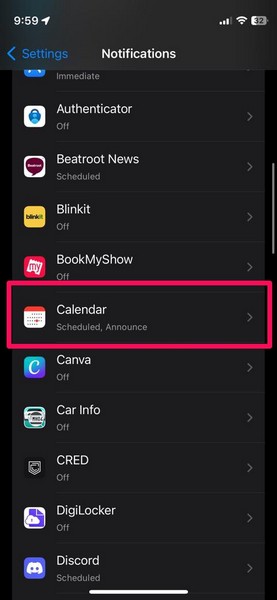 3.Unter demBenachrichtigungsstilAbschnitt, suchen Sie dieKalender-AppUndTippen Sie darauf, um es zu öffnen.