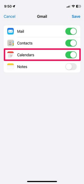 5.Stellen Sie sicher, dass der Schalter für dieKalenderDie Option ist für alle zuvor auf Ihrem iPhone hinzugefügten Konten aktiviert. Wenn einer von ihnen nicht aktiviert ist,Tippen Sie auf den Schalterzu ermöglichen.
