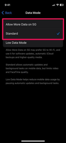 5.Stellen Sie hier sicher, dass dieDatenmodusist auf beides eingestelltStandardoderErlauben Sie mehr Daten über 5G.