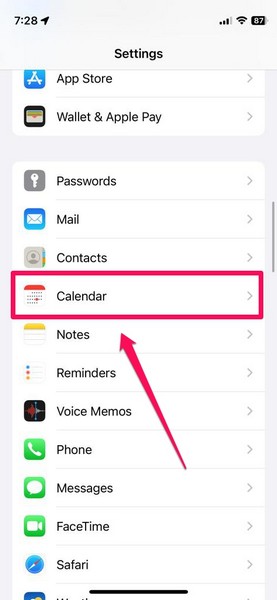 2.Suchen Sie dieKalenderOption undTippen Sie darauf, um es zu öffnenseine Einstellungen.