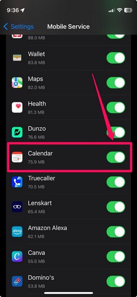 3.Unter demMobile DatenAbschnitt, suchen Sie dieÖffnen Sie die Kalender-App und stellen Sie sicher, dass der Schalter dafür aktiviert istauf Ihrem iPhone.
