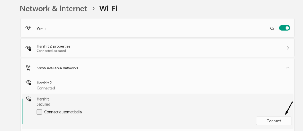 3.Zum Schluss klicken SieVerbindenneben dem Netzwerk, um Ihren Windows 11-PC oder Laptop damit zu verbinden.