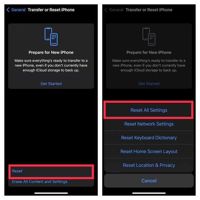 2.Tippen Sie nun aufZurücksetzenunten und schlagenAlle Einstellungen zurücksetzenim Menü. Wenn Sie dazu aufgefordert werden, geben Sie Ihren iPhone-Passcode ein und klicken SieAlle Einstellungen zurücksetzenerneut im Popup-Menü zur Bestätigung.