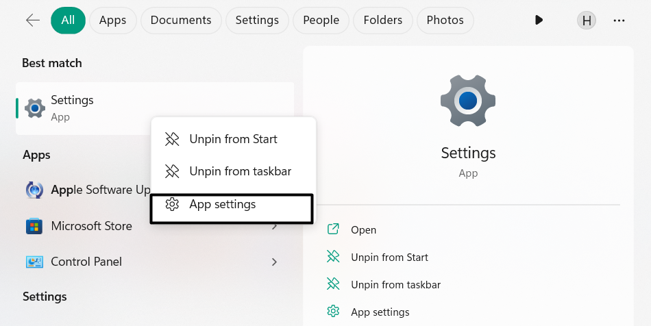 2.Klicken Sie mit der rechten Maustaste aufEinstellungen-Appin den Suchergebnissen untenBeste Übereinstimmungund wählenApp-Einstellungen.