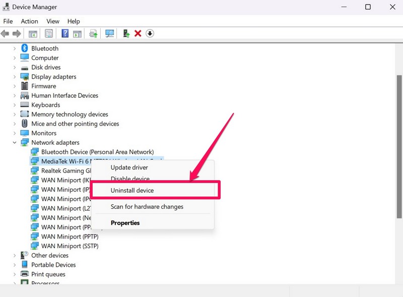 Wenn der DNS-Server in Windows 11 nicht funktioniert oder nicht reagiert, können Sie jetzt auch den Netzwerkadapter auf Ihrem Gerät neu installieren. Dadurch werden alle kleineren Probleme mit dem Netzwerkadapter behoben und das Problem, dass der DNS-Server in Windows 11 nicht funktioniert, kann leicht behoben werden. Um den Netzwerkadapter in Windows 1 neu zu installieren, führen Sie die folgenden Schritte aus.