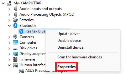 2.Erweitern Sie dieBluetoothKlicken Sie mit der rechten Maustaste auf den AbschnittBluetooth-Adapter, und wählen SieEigenschaften.