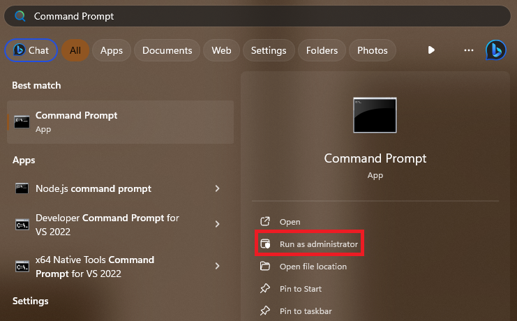 1.Suchen nachEingabeaufforderungin der Suchleiste des Startmenüs und klicken Sie aufAls Administrator ausführenOption.
