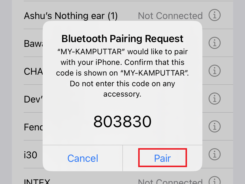 5.Nachdem Sie auf den Namen des Telefons geklickt haben, erscheint eine PIN auf Ihrem Bildschirm. Überprüfen Sie, ob auf Ihrem Telefon eine Kopplungsanfrage vorliegt. Wenn der Kopplungscode übereinstimmt, klicken Sie aufPaarTaste auf Ihrem Telefon.