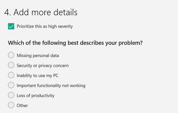 7.UnterWelche der folgenden Aussagen beschreibt Ihr Problem?, wählenWichtige Funktionalität funktioniert nicht.