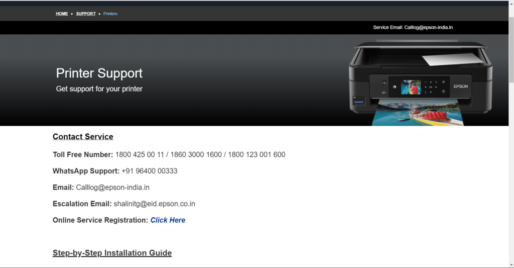 2.Auf der nächsten Seite sehen Sie die Kontaktinformationen, mit denen Sie Kontakt aufnehmen könnenEpsonSupport-Team. Sie können sie per E-Mail, Telefonnummer und sogar WhatsApp auf Ihrem Gerät kontaktieren.