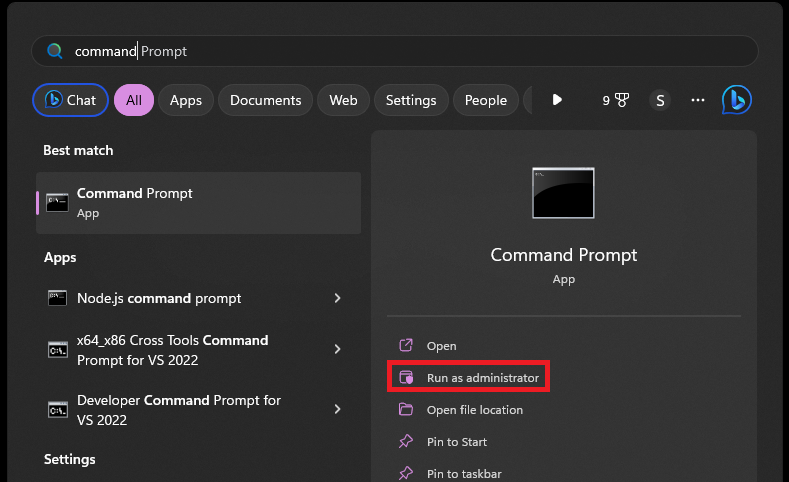 1.Öffnen Sie dieStartMenü, suchen Sie nachEingabeaufforderung, und klicken Sie aufAls Administrator ausführenOption.