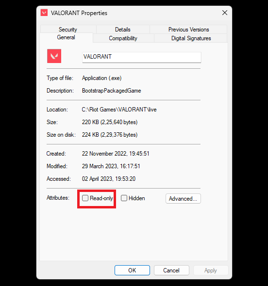 Wenn in der Eigenschaft der ausführbaren Datei der Anwendung nicht die richtigen Attribute festgelegt sind, werden beim Öffnen möglicherweise Fehler angezeigt. Das Attribut, das Sie hier überprüfen müssen, ist dasSchreibgeschütztAttribut. So können Sie überprüfen, ob die Datei auf eingestellt istSchreibgeschütztoder nicht.