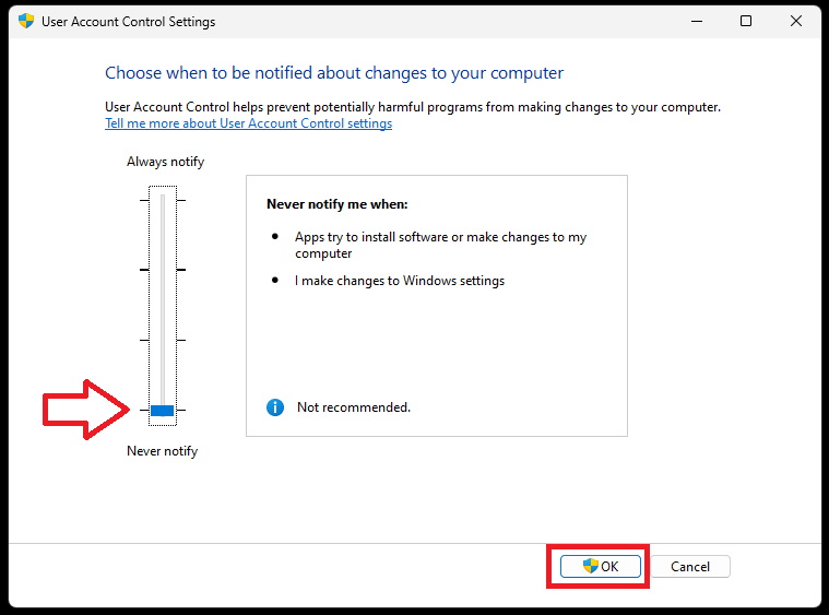 2.Ziehen Sie den Schieberegler nach untenBenachrichtigen Sie niemals,und klicken Sie aufOKTaste.