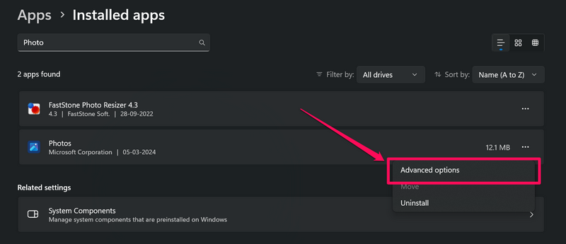 Es besteht also eine hohe Wahrscheinlichkeit, dass das Problem, dass das Generative Löschen nicht funktioniert, durch das Reparieren und Zurücksetzen der Fotos-App auf Ihrem Windows 11-PC oder -Laptop sofort behoben werden kann. Sie können die folgenden Schritte ausführen, um die Fotos-App unter Windows 11 zu reparieren und/oder zurückzusetzen:
