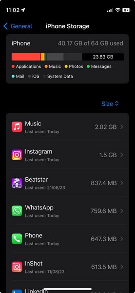 Falls auf Ihrem Gerät nicht genügend Speicherplatz vorhanden ist, müssen Sie Apps, Medien und andere Dateien von Ihrem iPhone löschen. Sie können auch zum geheniPhone-SpeicherEinstellungen über dieAllgemeinÖffnen Sie die Seite „Einstellungen“ in der App „Einstellungen“ und befolgen Sie die empfohlenen Vorschläge zum Löschen des Speichers, um Platz für das iOS 17-Update zu schaffen.
