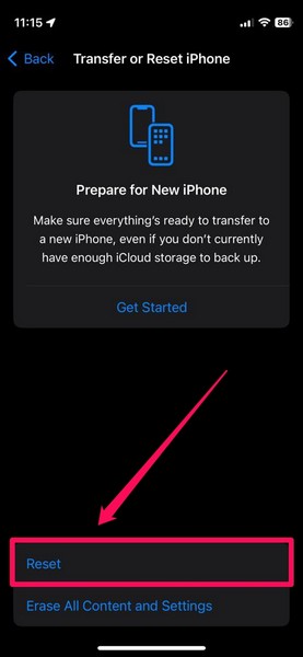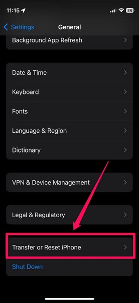 3.Scrollen Sie nach unten, um das zu findeniPhone übertragen oder zurücksetzenOption unten.’