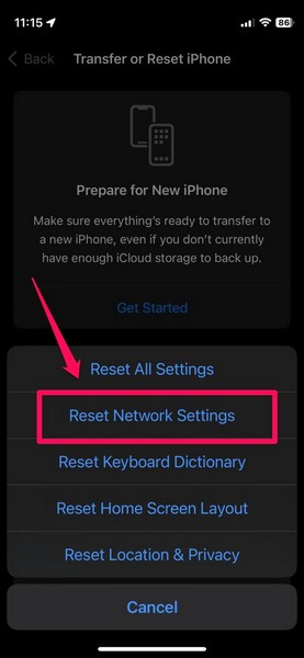 Sie können auch versuchen, das iOS 17-Update, das in der Phase „Update angefordert“ hängen bleibt, auf Ihrem iPhone zu beheben, indem Sie die Netzwerkeinstellungen Ihres Geräts zurücksetzen. Es ist jedoch erwähnenswert, dass dadurch alle Ihre vorherigen WLAN- und Bluetooth-Geräte gelöscht werden und Sie sie erneut mit Ihrem iPhone verbinden müssen.