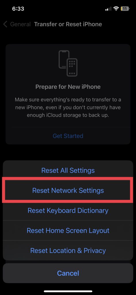 Versuchen Sie, die Netzwerkeinstellungen Ihres iPhones zurückzusetzen. Dadurch werden alle Ihre netzwerkbezogenen Einstellungen, einschließlich WLAN-Passwörter und Mobilfunkeinstellungen, auf ihre Standardwerte zurückgesetzt. Um dies zu tun,