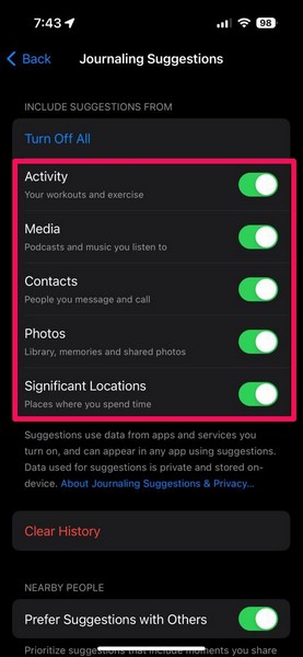 6.Das können Sie auchScrollen Sie auf dieser Seite nach untenUndAktivieren Sie die SchalterfürVorschläge bevorzugen mit AnderenUndFür andere erkennbarum ein besseres Erlebnis mit den Journaling-Vorschlägen zu erhalten, während Sie die Journal-App auf Ihrem Gerät verwenden.