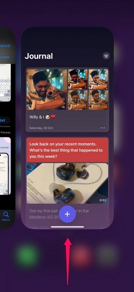 2. Tippen und halten Sie die Journal-App-Karteauf dem App-Karussell undnach oben schieben, um das Schließen zu erzwingenauf Ihrem iPhone.