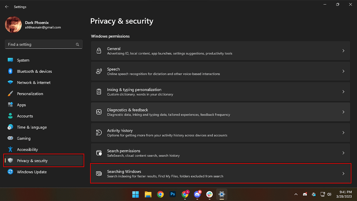 - Klicken Sie aufDatenschutz und SicherheitKlicken Sie im linken Bereich > im Abschnitt „Windows-Berechtigungen“ auf das SymbolDurchsuchen von WindowsTab.