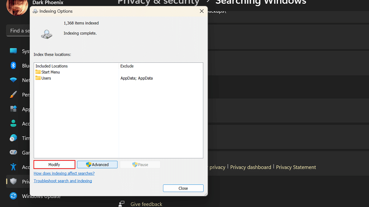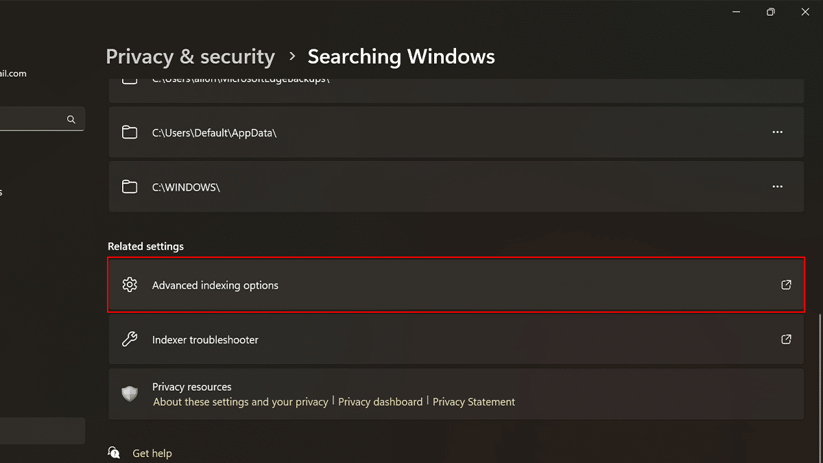 - Klicken Sie im Abschnitt „Zugehörige Einstellungen“ auf „Erweiterte Indizierungsoptionen.