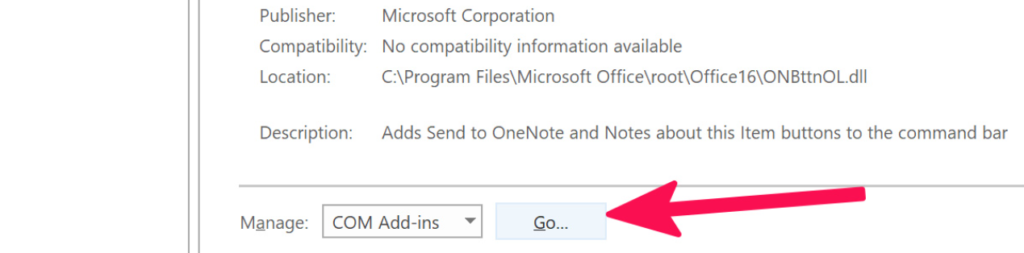 3.Klicken Sie nun aufGehenOption neben demVerwalten: COM-Add-InsOption und aktivieren Sie dann die Kontrollkästchen neben allen Add-Ins.