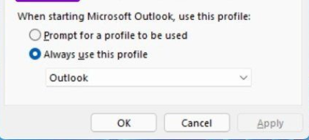 6.Wählen Sie nach dem Erstellen des Profils das aus neu erstelltes Profil aus demBeim Starten von Microsoft OutlookMenü und drücken SieAnwendenum es als Standardprofil festzulegen.