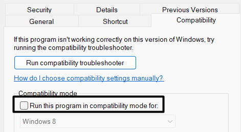 3.Deaktivieren Sie abschließend dieFühren Sie dieses Programm aus Kompatibilitätsmodus fürOption unter derKompatibilitätsmodusAbschnitt.
