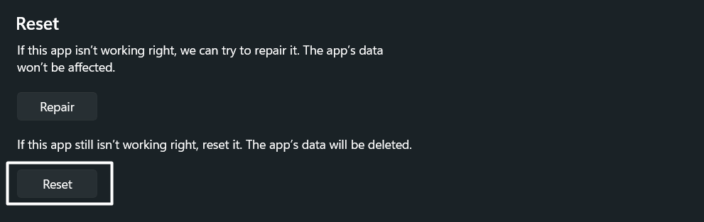 5.Klicken Sie abschließend aufZurücksetzenOption in derZurücksetzenAbschnitt zum Zurücksetzen der App durch Löschen ihrer temporären und anderen Daten.