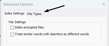 2.Klicken Sie aufFortschrittlichund dann weitermachenDateitypenum alle Formate anzuzeigen und zu bearbeiten, die Windows Search indizieren darf.