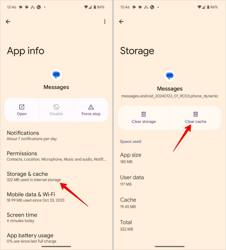 Das Löschen des Caches und der App-Daten für Ihre Messaging-App kann dabei helfen, vorübergehende Störungen zu beheben, die das Herunterladen von MMS möglicherweise stoppen.