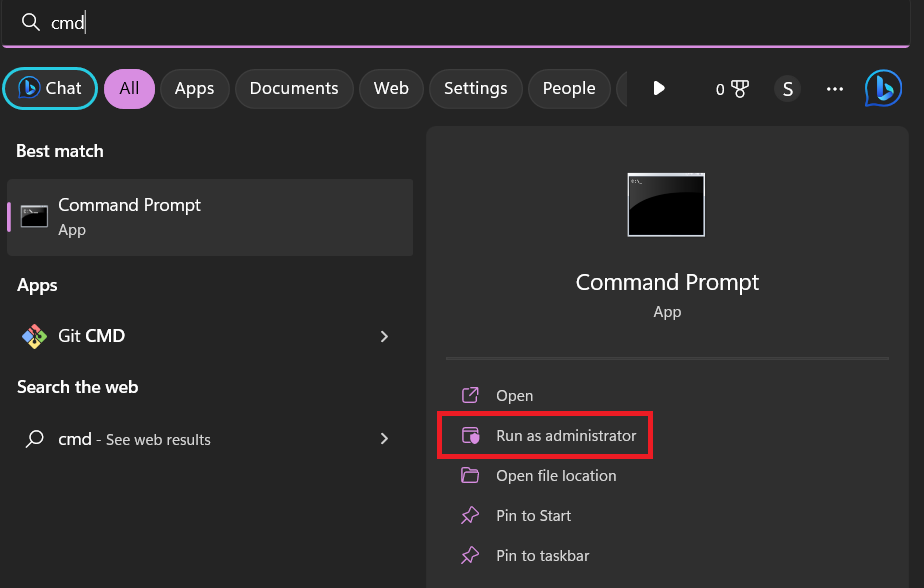 1.Öffnen Sie die Windows-Suche und geben Sie einCMD,und wählen Sie dieAls Administrator ausführenOption.