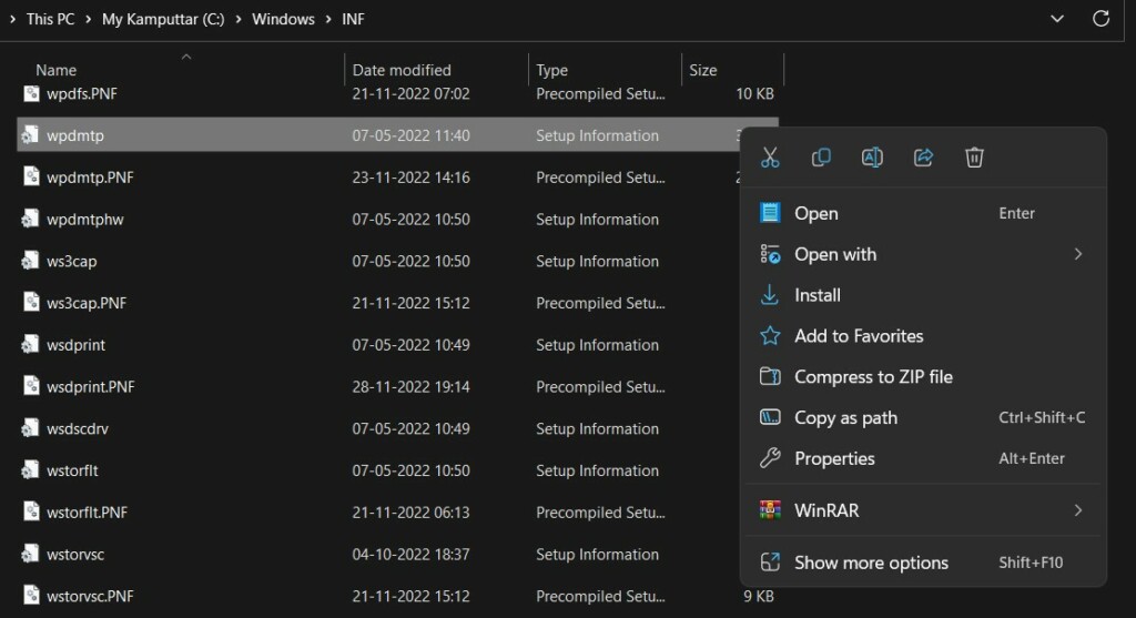 Wenn Sie das nicht finden könnenwpdmtpKopieren Sie die Datei von einem anderen PC mit Windows 11 und fügen Sie sie in den INF-Ordner auf Ihrem PC ein.